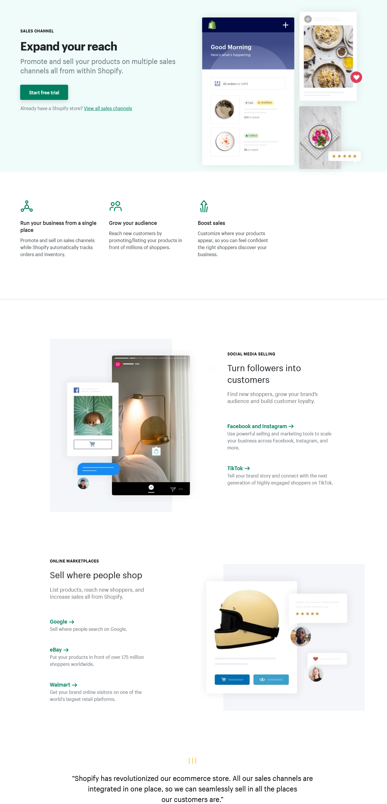 - Growth opportunities with Shopify’s sales channels and an enterprise plan for merchants selling in high volume who want to decrease transaction fees
